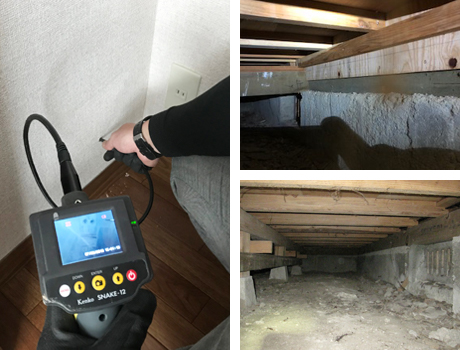 床下に入れない場合でも小さな穴をあけてファイバースコープで確認することもできます。